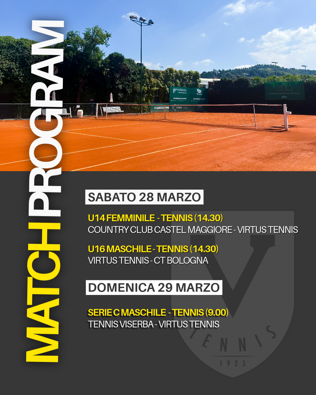 Di seguito è possibile consultare il Match Program delle partite che vedranno protagoniste, nel corso del weekend, le squadre della Virtus Tennis impegnate nei rispettivi Campionati.